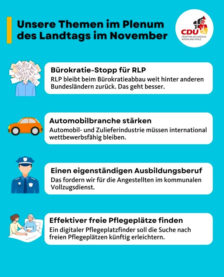Start für das November-Plenum im rheinland-pfälzischen Landtag. Das sind unsere Themen:Bürokratie-Stopp für RLPWir finden: Der Bürokratieabbau in Rheinland-Pfalz muss schneller gehen. Wir brauchen einen echten Systemwechsel, statt Klein-Klein. Wir brauchen weniger Papier, mehr Vertrauen und Handlungsspielräume, indem wir beispielsweise Beglaubigungen durch einfache Kopien ersetzen.Automobilbranche stärkenDie Automobil- und Zulieferindustrie ist zentraler Pfeiler der Wirtschaft in Rheinland-Pfalz. Doch Elektromobilität und geopolitische Handlungskonflikte verändern die Bedingungen der Branche grundlegend. Insbesondere das Verbrenner-Aus bedroht industrielle Kernkompetenzen und Arbeitsplätze. Deshalb schließen wir uns den Forderungen des MPK-Beschlusses für eine technologieoffene und mittelstandsfreundliche Industriepolitik an.Einen eigenständigen Ausbildungsberuf für die Angestellten im kommunalen VollzugsdienstDie Mitarbeiter im kommunalen Vollzugsdienst leisten bereits heute wichtige und hervorragende Arbeit. Doch die vielen Kenntnisse und Fähigkeiten, die zur Lösung der komplexen Aufgaben im kommunalen Ordnungsdienst wichtig sind, können nicht auf Dauer in zehnwöchigen Kursen an der Hochschule für Polizei vermittelt werden. Wir brauchen einen eigenen Ausbildungsberuf.Effektiver freie Pflegeplätze findenDie Suche nach freien Pflegeplätzen in Rheinland-Pfalz ist für Pflegebedürftige und Angehörige schwierig und zeitaufwendig. Eine zentrale, digitale Übersicht über verfügbare Plätze existiert bislang nicht. Das wollen wir mit dem digitalen Pflegeplatzfinder ändern.#bürokratieabbau #automobilbranche #kommunalervollzugsdienst #pflege #rlp