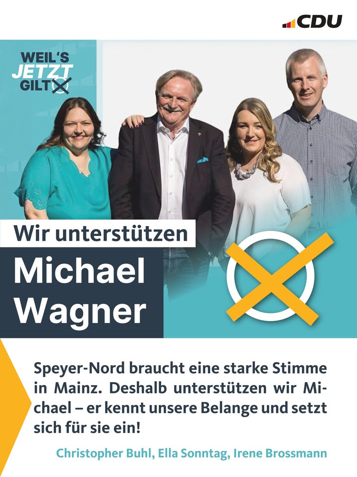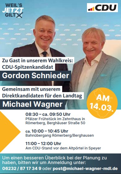 mehrCDU-Spitzenkandidat Gordon Schnieder besucht Wahlkreis Der Besuch beginnt um 08:30 Uhr mit einem Pfälzer Frühstück im Zehnthaus in Römerberg (Berghäuser Straße 50). Dort haben Parteimitglieder sowie interessierte Bürgerinnen und Bürger Gelegenheit, mit dem CDU-Spitzenkandidaten ins Gespräch zu kommen und aktuelle politische Themen zu diskutieren.Im Anschluss ist gegen 10:00 Uhr eine Ortsbegehung am Bahnübergang Berghausen (Dudenhofer Straße) vorgesehen. Dabei sollen insbesondere die Themen Bahnunterführung und Ortsumgehung erörtert werden.Den Abschluss des Besuchs bildet gegen 11:00 Uhr ein Bürgergespräch am CDU-Stand vor dem Altpörtel in Speyer, bei dem Gordon Schnieder für Fragen und Gespräche mit Bürgerinnen und Bürgern zur Verfügung steht.Ich freue mich sehr, dass unser Spitzenkandidat unseren Wahlkreis besucht und sich Zeit für Gespräche mit den Menschen vor Ort nimmt. Der direkte Austausch mit Bürgerinnen und Bürgern sowie der Blick auf konkrete Projekte vor Ort sind wichtige Bausteine für eine erfolgreiche Politik in Rheinland-Pfalz.Interessierte Bürgerinnen und Bürger sind herzlich eingeladen, an den einzelnen Programmpunkten teilzunehmen.