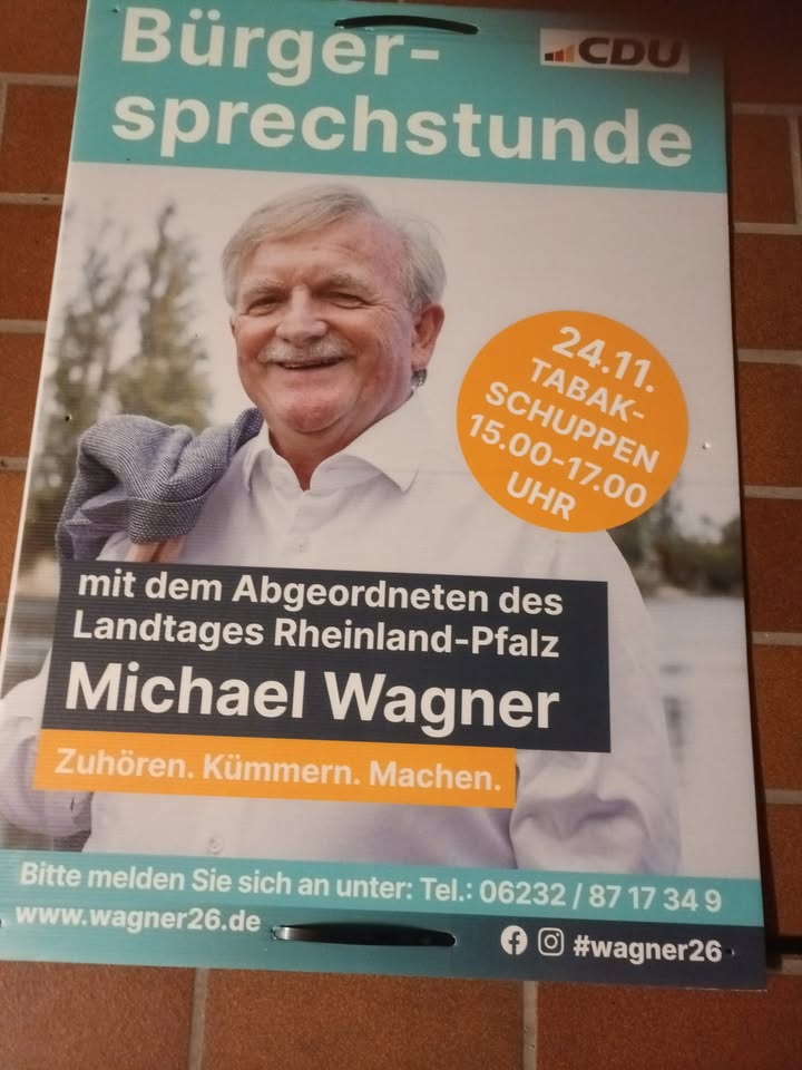 Ich lade zur Bürgersprechstunde in Harthausen einAm Montag, 24. November 2025, stehe ich den Bürgerinnen und Bürgern persönlich in Harthausen zur Verfügung. Die Bürgersprechstunde findet von 15:00 bis 17:00 Uhr im Tabakschuppen Harthausen statt.Bürgersprechstunden sind ein zentraler Bestandteil gelebter Demokratie: Sie ermöglichen den direkten Austausch zwischen Politik und Bevölkerung, schaffen Raum für individuelle Anliegen und geben wichtige Impulse für die politische Arbeit vor Ort.Interessierte werden gebeten, sich vorab unter 06232 8717349 anzumelden.#zuhörenkümmernmachen#wagner26#Bürgersprechstunde #Demokratie #Mitmachen #PolitikvorOrt
